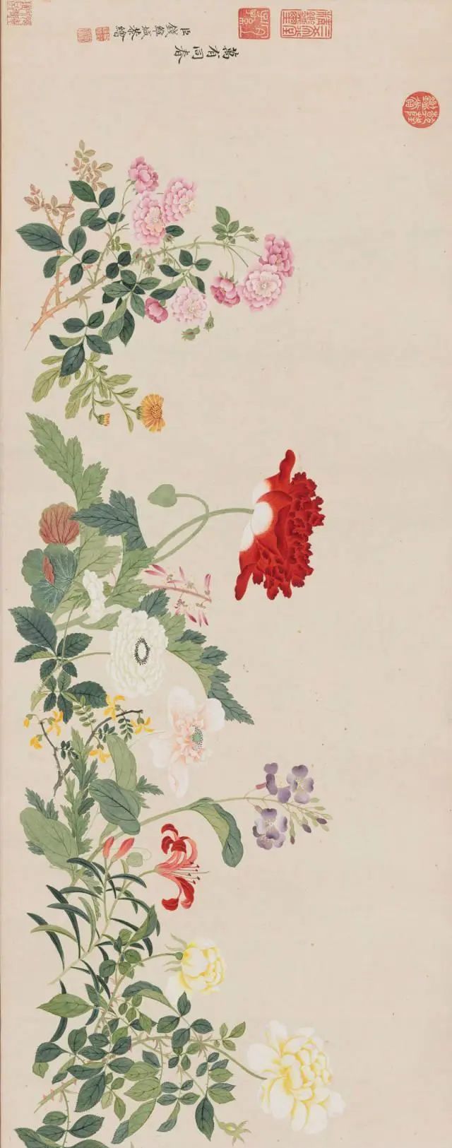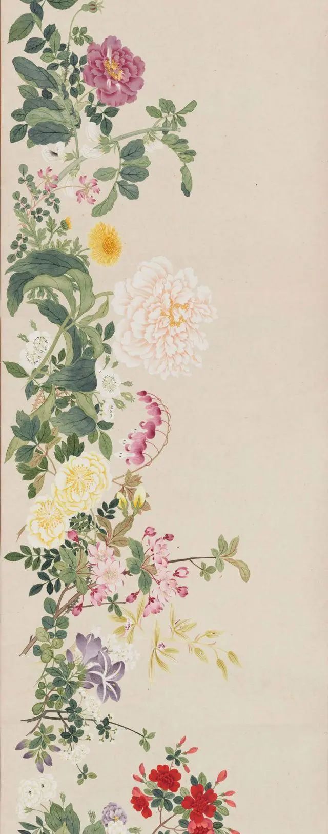 在技法上,钱维城运用了独特的没骨晕染技法。这种技法摒弃了传统的勾勒线条,而是直接用色彩晕染出花卉的形态与质感。这种技法使得花朵仿佛跃然纸上,栩栩如生,充满了生命力。钱维城以其细腻的笔触和丰富的色彩,将花瓣的柔嫩、叶片的脉络以及花卉的整体形态都表现得淋漓尽致。他巧妙地运用了红、黄、蓝、绿等多种色彩,通过色彩的对比与和谐,营造出一种灿烂富贵的庙堂气象,既符合乾隆皇帝的审美趣味,也体现了钱维城对宫廷绘画艺术的深刻理解。